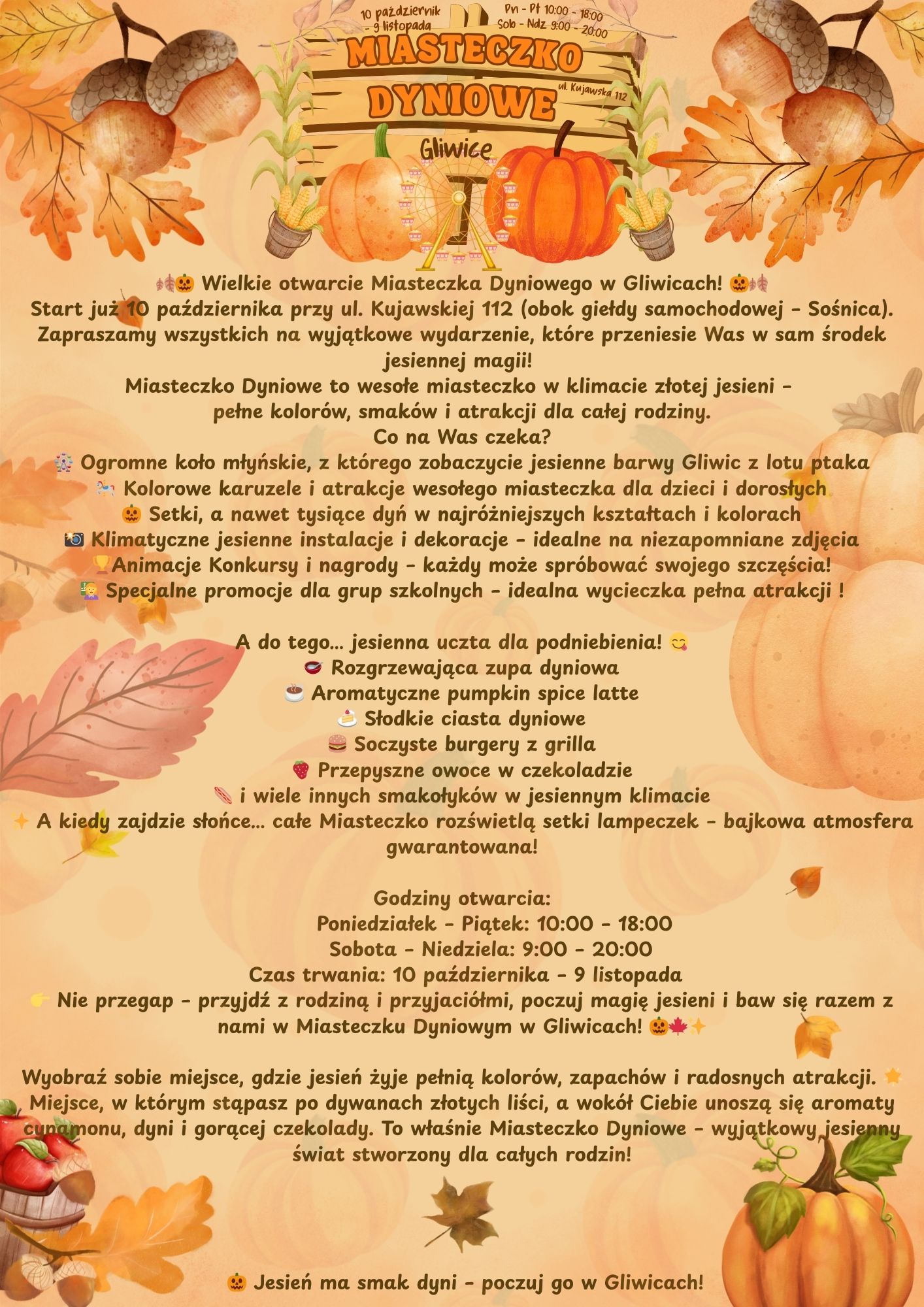 🍂🎃 Wielkie otwarcie Miasteczka Dyniowego w Gliwicach! 🎃🍂 📅 Start już 10 października przy ul. Kujawskiej 112 (obok giełdy samochodowej – Sośnica). Zapraszamy wszystkich na wyjątkowe wydarzeni-kopia