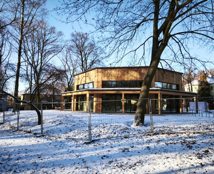 Po półtora roku prac budowlanych nowy „Okrąglak” to dwupoziomowy pawilon zwieńczony wielospadowym, namiotowym dachem. Na parterze stworzono salę konsumpcyjną dla 40 gości z barem oraz rozsuwanymi przeszkleniami, które w ciepłe dni otworzą wnętrze na parkowy krajobraz. Zadaszone podcienia ze stolikami staną się naturalnym przedłużeniem sali – miejscem letnich śniadań, rozmów przy kawie i spokojnych wieczorów. Zaplecze gastronomiczne obejmuje kuchnię, zmywalnię oraz pomieszczenia socjalne i magazynowe. Cały parter, w tym toalety, zaprojektowano bez barier architektonicznych, z myślą o osobach z niepełnosprawnościami.